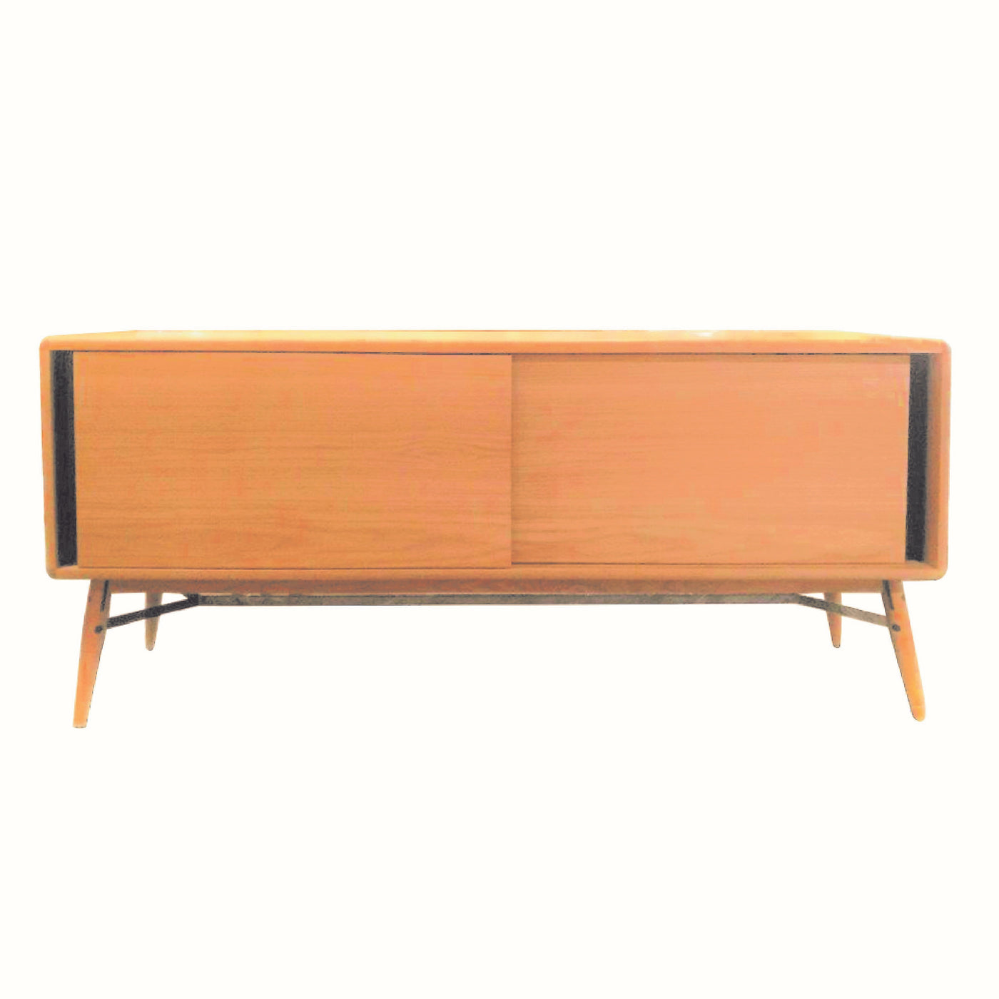 This simple Nordic designed TV cabinet is a clean, minimalism execution of Scandinavian aesthetic at its best. This TV cabinet designed by Denmark brand- Hübsch, made from oak and metal support , it comes with one glass shelf and two sliding doors add accessibility in small space.